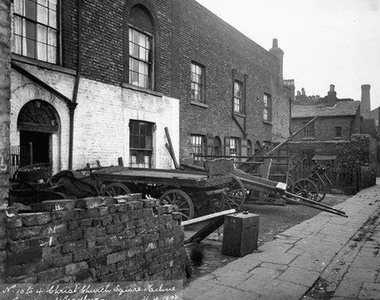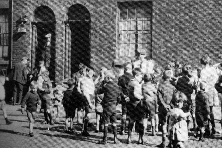 In the days before Radio and Television one way in which people could hear music was from street musicians. The person in the center of this small crowd of children appears to be playing the accordion and has attracted some interest among the children, while the adults stand at the doors listening and watching the children. The fact that there are men present and children around suggest that the photograph might have been taken on a Sunday morning. Another clue which supports this is the presence of two small birdcages which can be seen to the left of the doorways. The absence of any women suggest they they are either preparing a meal or doing the weekly cleaning, and the birds had been put outside for some fresh air while the housework was being completed. The size of the cages would be criticized today as not allowing the birds enough room to move around but the birds themselves would have livened up a drab house.