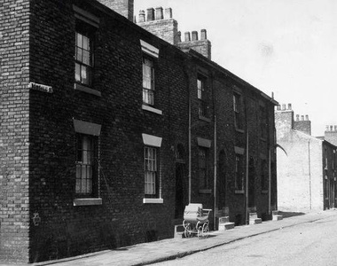 As Hulme developed in the early 19th century many developers tried to fit as many houses as possible on one site. One way in which this was done was to create ' courts '. These consisted of houses built around a square with an entrance at one end and the necessary sanitation facilities in the centre. Although this illustration gives the impression of a court, it is probably not one. The terraces in the background appear to be completely seperate from those on the other side.
